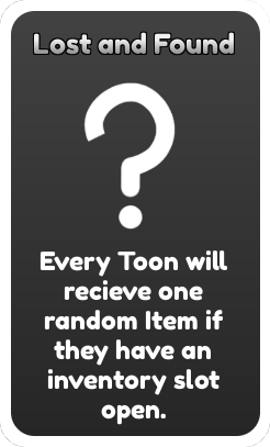 Every Toon will receive one random Item if they have an inventory slot open. | |