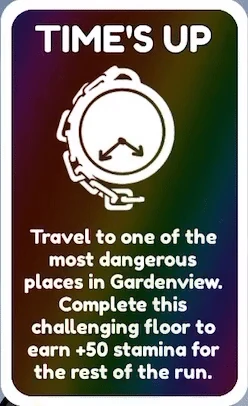 Travel to one of the most dangerous places in Gardenview. Complete this challenging floor to earn +50 stamina for the rest of the run. | |